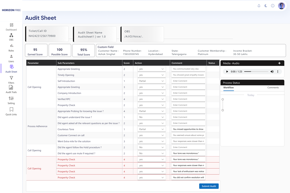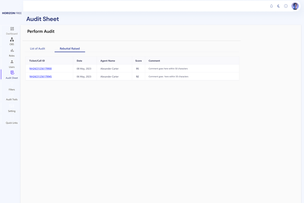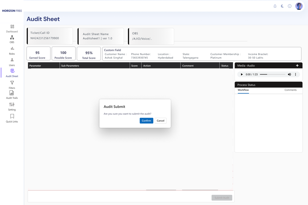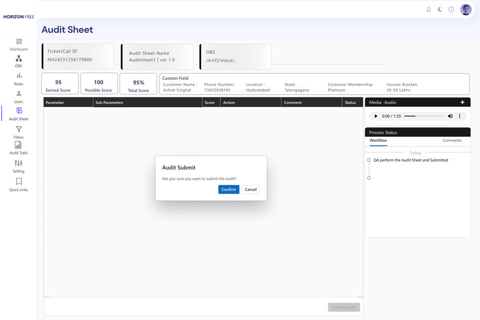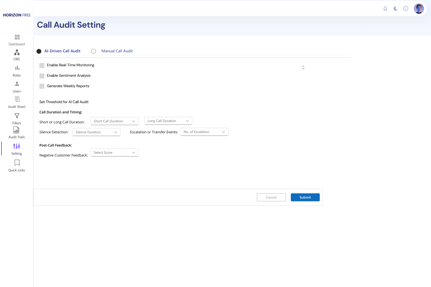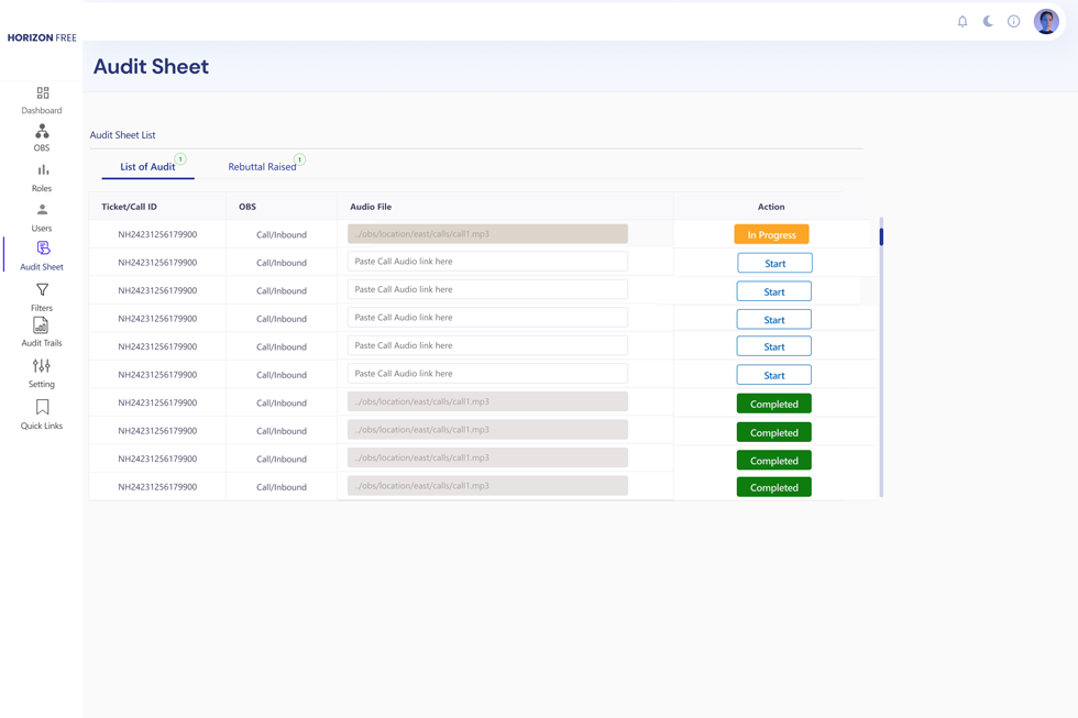 | DASHBOARD | OBS | ROLES | USERS | AUDIT SHEET | FILTERS | AUDIT TRAILS | SETTING | QUICKLINKS |