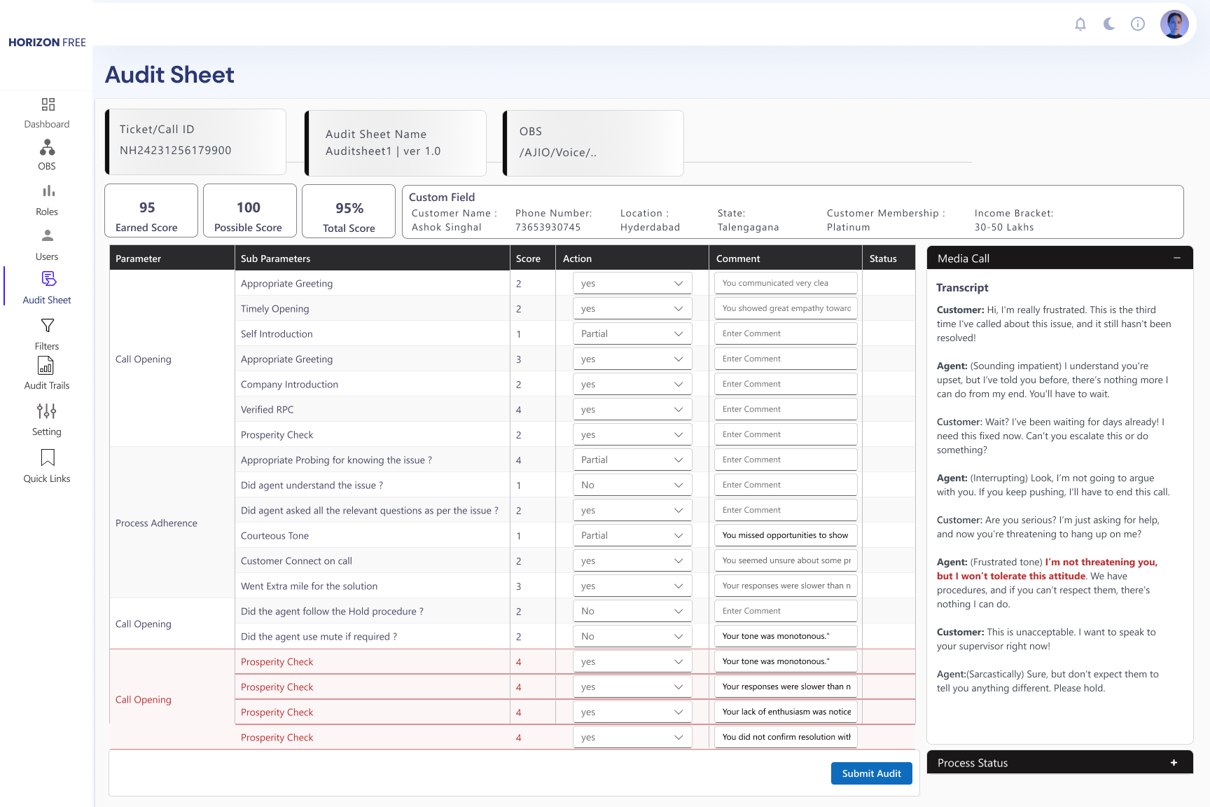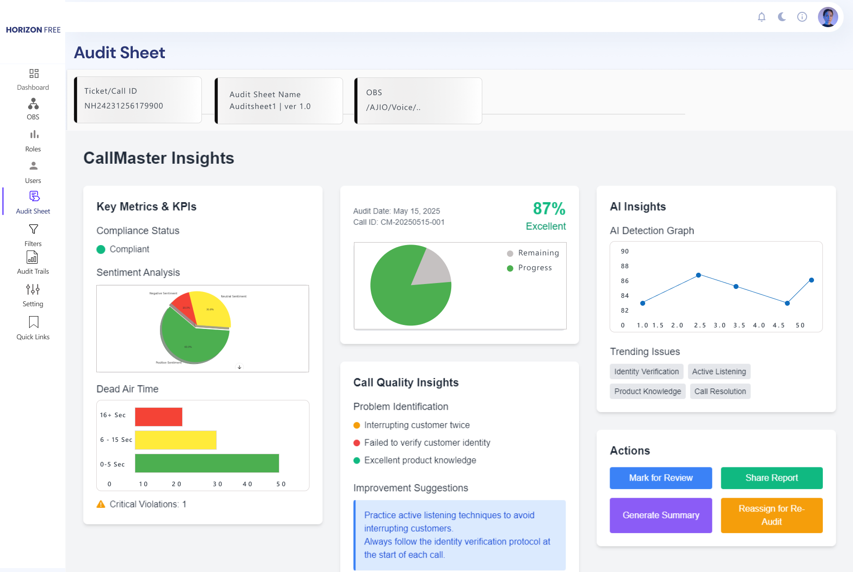 The project's scope included developing a user-friendly interface for QA analysts and managers to review flagged calls, analyze trends, and generate reports. Additionally, the system was designed to integrate seamlessly with existing call center infrastructure, ensuring minimal disruption to daily operations. The overarching goal was to create a tool that not only detects policy violations but also supports continuous improvement in customer service quality.