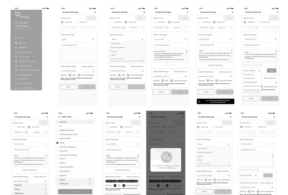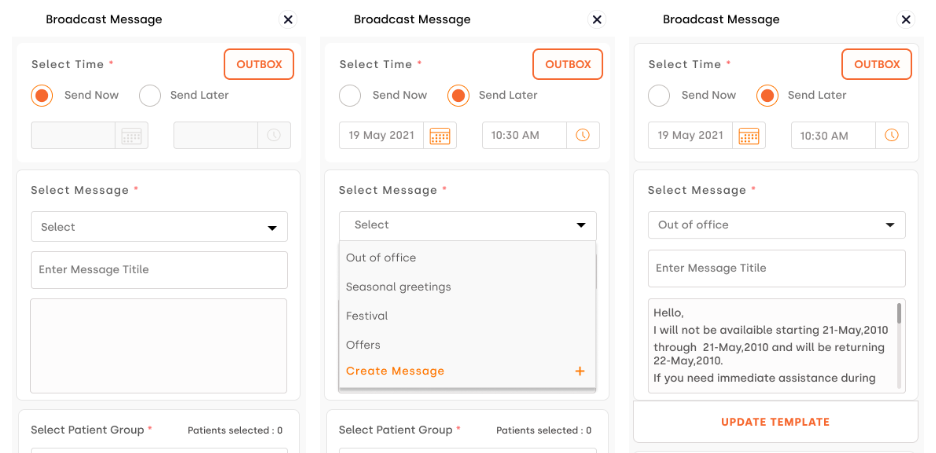 | User selects the "Compose Message" option from the dashboard or navigation menu. User is presented with the message composition interface, where they can customize the message content. User can choose from predefined templates or create a new message from scratch. User selects the message type (e.g., "out of office," "seasoned greetings," festival, offers, etc.). User specifies the patient group to whom the message should be sent based on ailments, status, adherence, or custom groups. User selects the preferred communication channel (SMS or push notification). User has the option to send the message immediately or schedule it for later by choosing the date and time. |